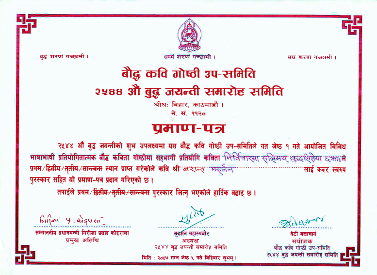 २५४४ औ बौद्ध जयन्ती समारोह, बौद्ध कवि गोष्ठी उपसमितिद्वारा आयोजित कविता प्रतियोगिमामा प्रथम पुरस्कार प्राप्त