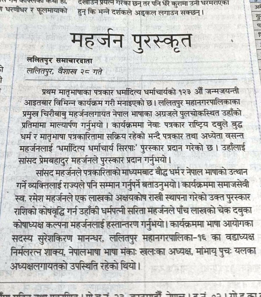 बौद्ध विद्वान, अग्रज बौद्ध अभियन्ता एवं प्रथम मातृभाषा पत्रकार धर्मादित्य धर्माचार्यको नाममा स्थापित पुरस्कार धर्मादित्य पत्रकारिता पुरस्कार (२०२५) मलाई प्राप्त भएको छ । नेवाः पत्रकार राष्ट्रिय दबू ९ललितपुर शाखा० द्वारा स्थापित र प्रत्येक वर्ष प्रदान गरिन्छ । धर्मादित्य धर्माचार्यले भारतको कलकत्ताबाट “बौद्ध धर्म व नेपालभाषा” म्यागेजिन प्रकाशित गर्नुभएको एक शताब्दी भएको छ । यस बीचमा नेपालमा बौद्ध धर्म र नेपालभाषाले धेरै कोल्टे फेरिसकेको छ र प्रत्येक कोल्टे फेराई प्रगतिउन्मुख नै साबित भयो । जुन व्यक्तित्वको पदचाप पछ्याउँदै हिडिरहेको छु उनकै नाममा स्थापित पुरस्कार ग्रहण गर्न पाउनु मेरो लागि विशेष कुरा हो । नेपालभाषामा मेरो पत्रकारिता २०५२ सालमा विश्वभूमि दैनिकबाट भएको हो ।