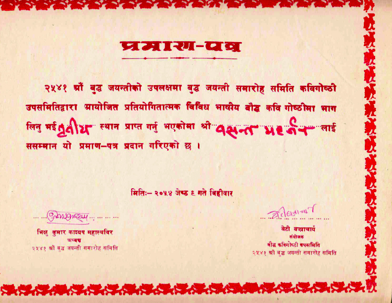 प्रत्येक वैशाख पूर्णिमाका दिन काठमाडौंमा बुद्ध जयन्ती मनाइन्छ । विभिन्न बौद्ध क्रियाकलापको आयोजना तथा प्रतियोगितासहित मनाइने यस अवसरमा बौद्ध कविता प्रतियोगिता पनि हो । २०५४ सालमा २५४१ औं बुद्ध जयन्तीको उपलक्षमा आयोजित एक प्रतियोगितामा म पनि सहभागी भएको थिएँ र तृतीय पुरस्कार प्राप्त गरें ।