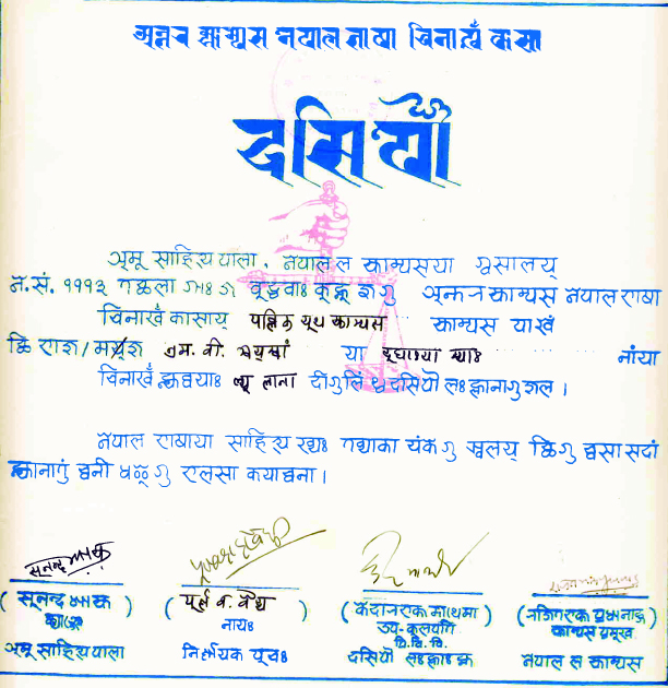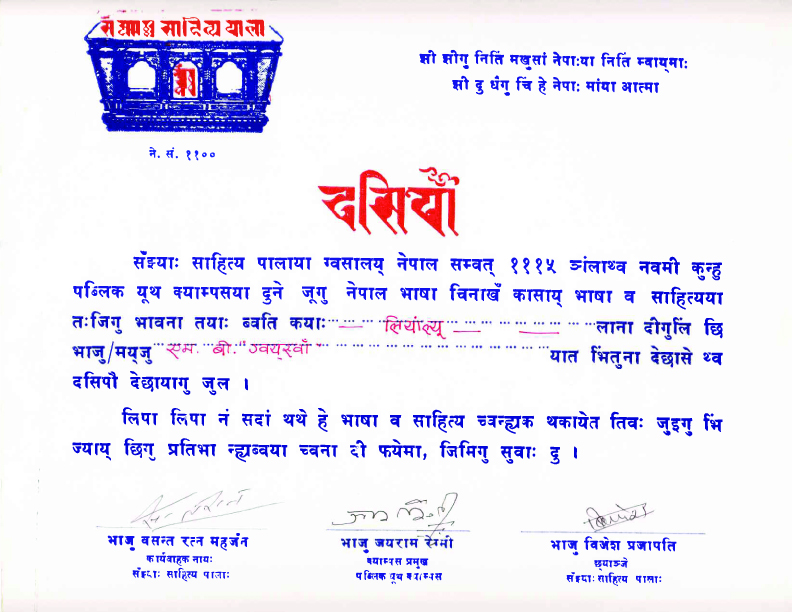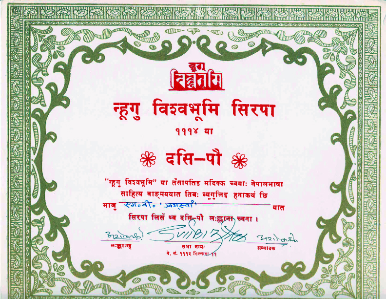 न्हूगु विश्वभूमि दैनिक पत्रिकाको परिशिष्टाङ्गमा नियमित लेखन गरेबापत न्हूगु विश्वभूमि सिरपा प्रदान गरिएको हो । यति बेला म एम.बी. ग्वयस्वां नामबाट लेख्थें ।