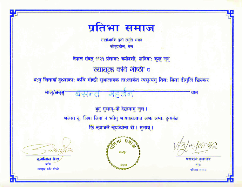 सँझ्याः साहित्य पाला (पब्लिक युथ क्याम्पस) द्वारा आयोजित कविता प्रतियोगितामा तृतीय पुरस्कार प्राप्त । यति बेला म एम.बी. ग्वयस्वां नामबाट लेख्थें ।